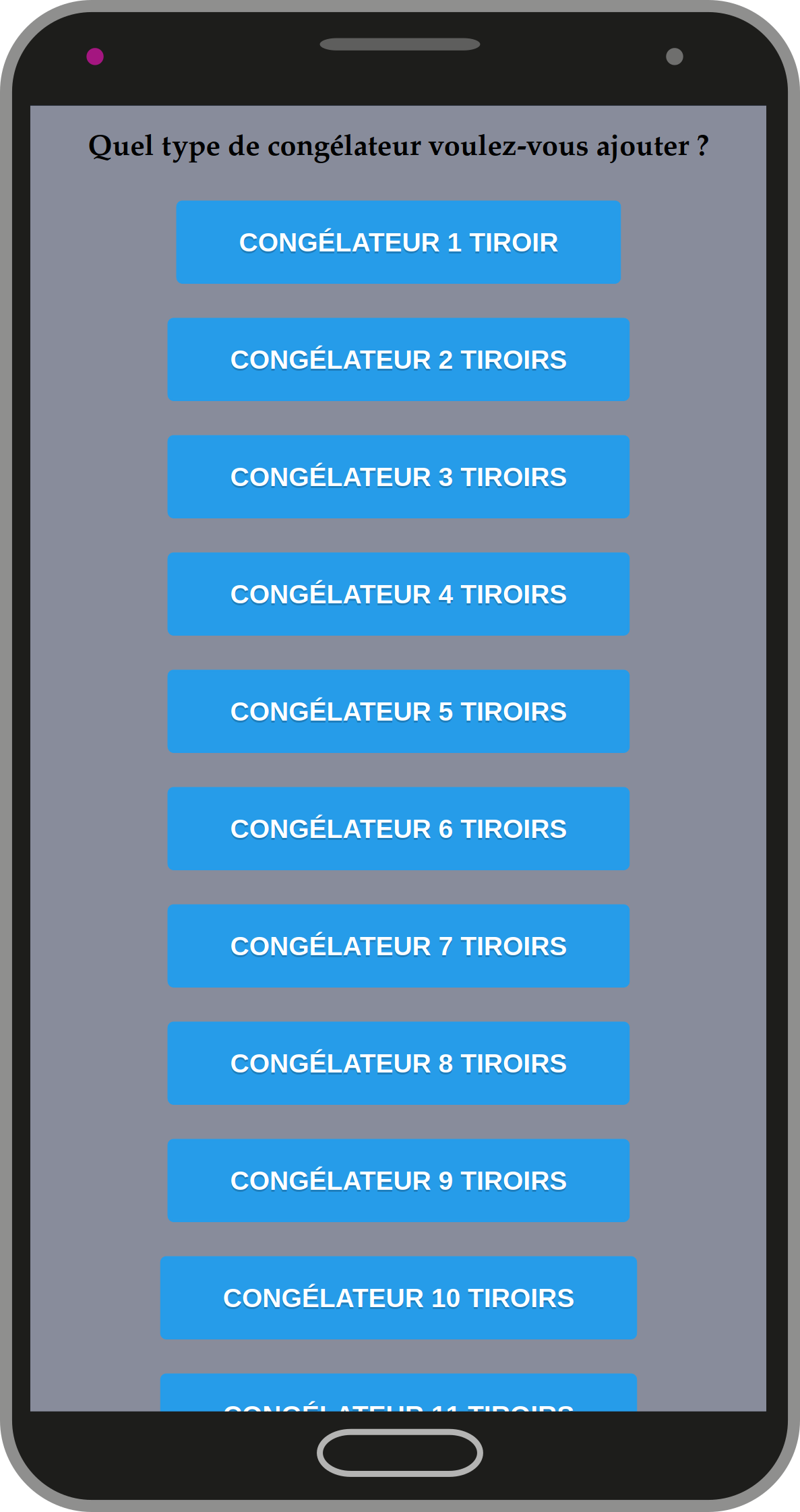 Frizor permet de créer et gérer jusqu’à 11 congélateurs avec 12 tiroirs maximum par congélateur. Si vous créez plusieurs congélateurs, donnez leur un nom afin de les identifier plus facilement.