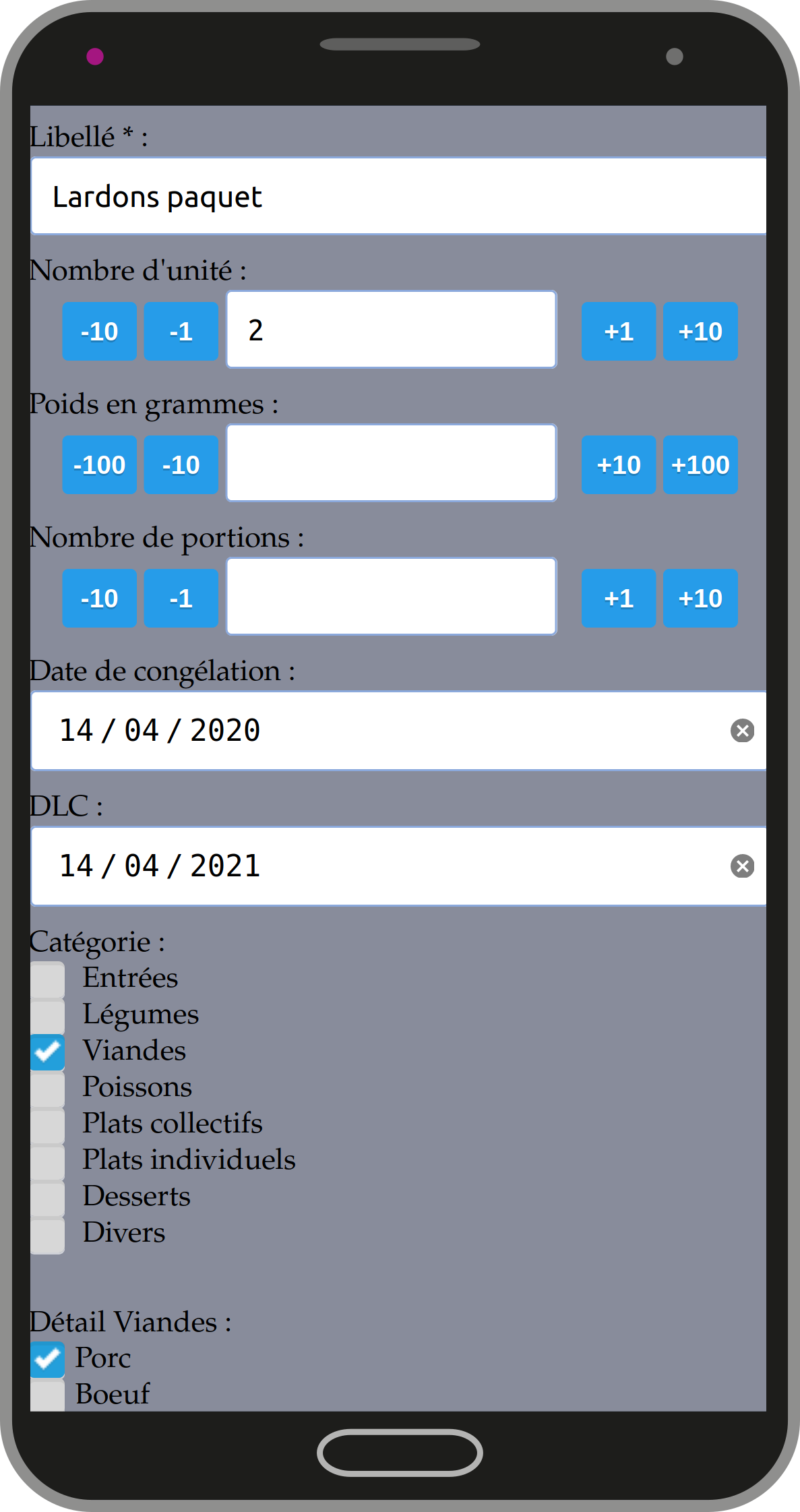 Frizor vous offre la possibilité de renseigner les produits de manière détaillée : possibilité de choisir une quantité, un poids, une date de congélation, ainsi que la DLC.